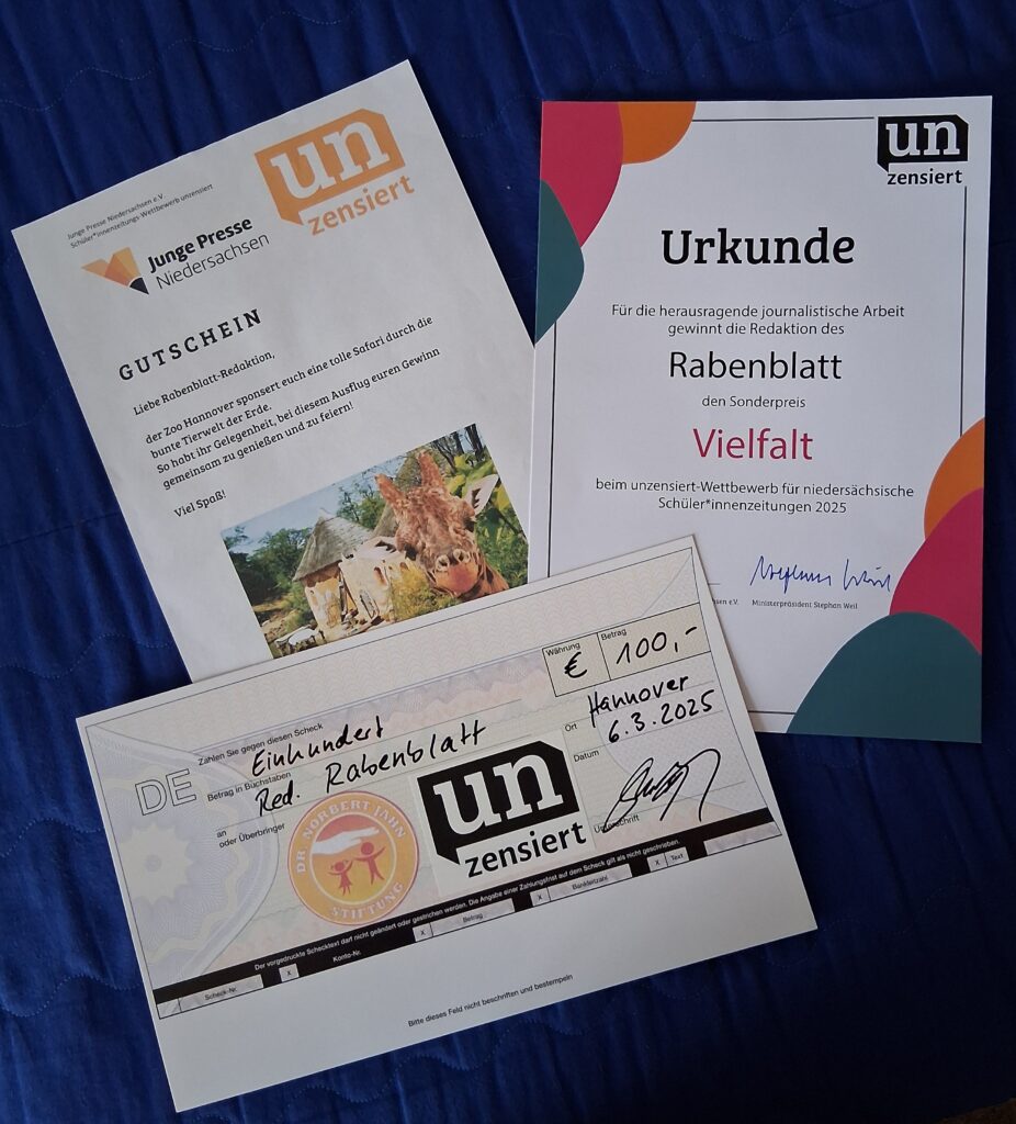 Die Rabenblatt-Redakteurinnen strahlten mit dem Himmel um die Wette, als sie am 06.03.25 von der Preisverleihung aus Hannover zurückkehrten. Dort hatte der JPN (Jugendmedienverband Junge Presse Niedersachsen) unter der Schirmherrschaft von Ministerpräsident Stephan Weil, der die Nachwuchsjournalistinnen übrigens persönlich begrüßte, wieder die besten Zeitungen niedersächsischer Schulen ausgezeichnet.