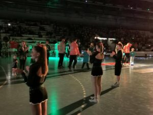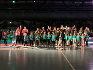 Am Anfang hat uns ein Mitarbeiter begrüßt und uns erklärt, was wir später machen sollten. Dann ging es auch schon los: Die Cheerleader zeigten ihre Show und „wärmten das Publikum auf“. Danach sind wir Kinder vor allen eine Runde allein durch die Halle gerannt. Dabei konnten die Zuschauer schon einmal „Jubeln und Klatschen üben“. Nun mussten wir noch kurz in einem Raum warten, die Spannung stieg…