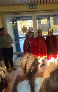 In der ersten Januarwoche hatten wir Besuch von Sternensingern. Es wurde gesungen, informiert und der Segungsspruch geklebt. Für die Erst- und Zweitklässler ein tolles Erlebnis!
